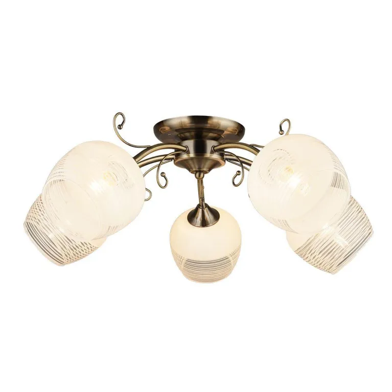 Преобладающий цвет люстры: Белый, плафонов: Белый, арматуры: Античная бронза; материал изготовления арматуры: Металл, размеры, мм: / высота 225 / диаметр 580. Общая мощность – 300 Ватт. Основной тип ламп, предусмотренный производителем: Накаливания с цоколем E27. В зависимости от предпочтений можно использовать лампы теплового, холодного или нейтрального света, за исключением люстр с типом цоколя LED.
