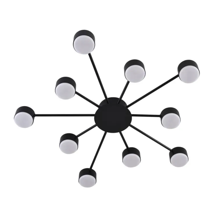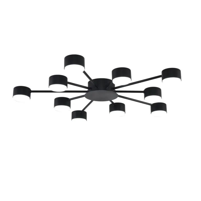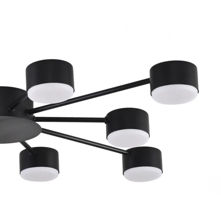 Преобладающий цвет плафонов: Черный, арматуры: Черный; материал изготовления арматуры: Металл, размеры, мм: / высота 73 / диаметр 780. Общая мощность – 70 Ватт, а максимальная площадь освещения до 14 м2. Основной тип ламп, предусмотренный производителем: Светодиодная с цоколем GX53. В зависимости от предпочтений можно использовать лампы теплового, холодного или нейтрального света, за исключением люстр с типом цоколя LED.