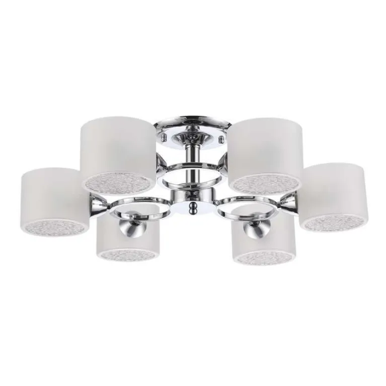 Преобладающий цвет люстры: Белый, плафонов: Белый, арматуры: Хром; материал изготовления арматуры: Металл, размеры, мм: / высота 180 / диаметр 610. Общая мощность – 240 Ватт, а максимальная площадь освещения до 13,3 м2. Основной тип ламп, предусмотренный производителем: Накаливания с цоколем E14. В зависимости от предпочтений можно использовать лампы теплового, холодного или нейтрального света, за исключением люстр с типом цоколя LED.