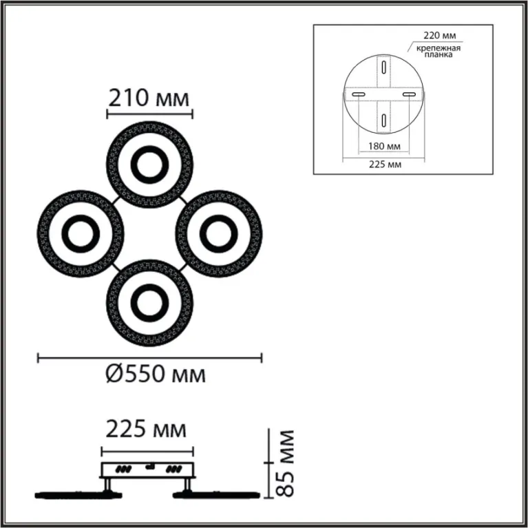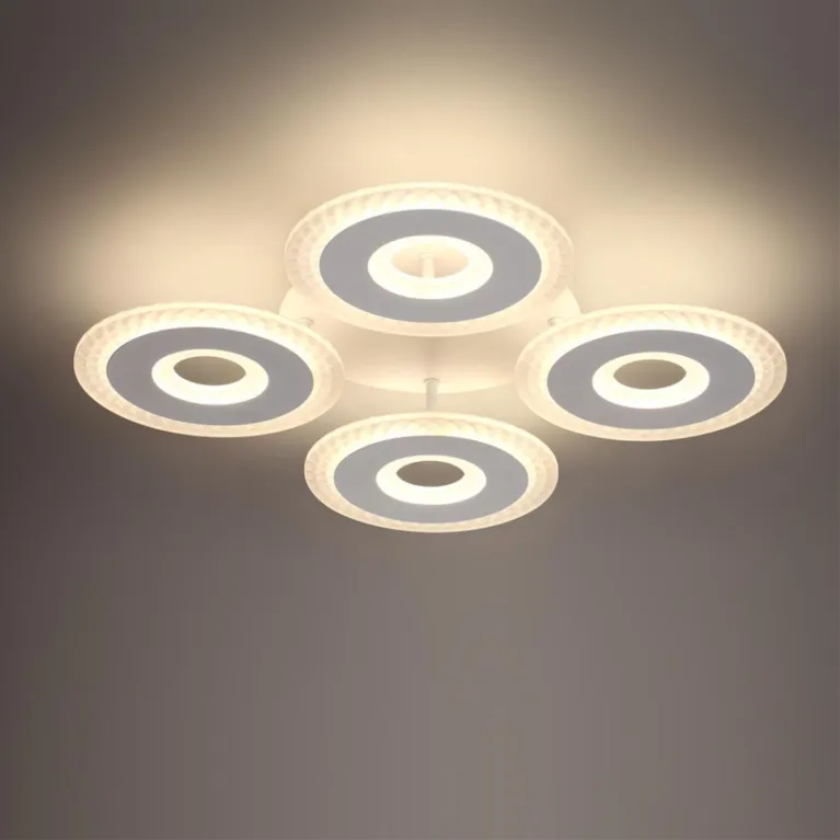 Преобладающий цвет плафонов: Прозрачный, арматуры: Белый; материал изготовления арматуры: Металл, размеры, мм: / высота 85 / диаметр 550. Общая мощность – 70 Ватт. Основной тип ламп, предусмотренный производителем: Светодиодная с цоколем LED. В зависимости от предпочтений можно использовать лампы теплового, холодного или нейтрального света, за исключением люстр с типом цоколя LED.
