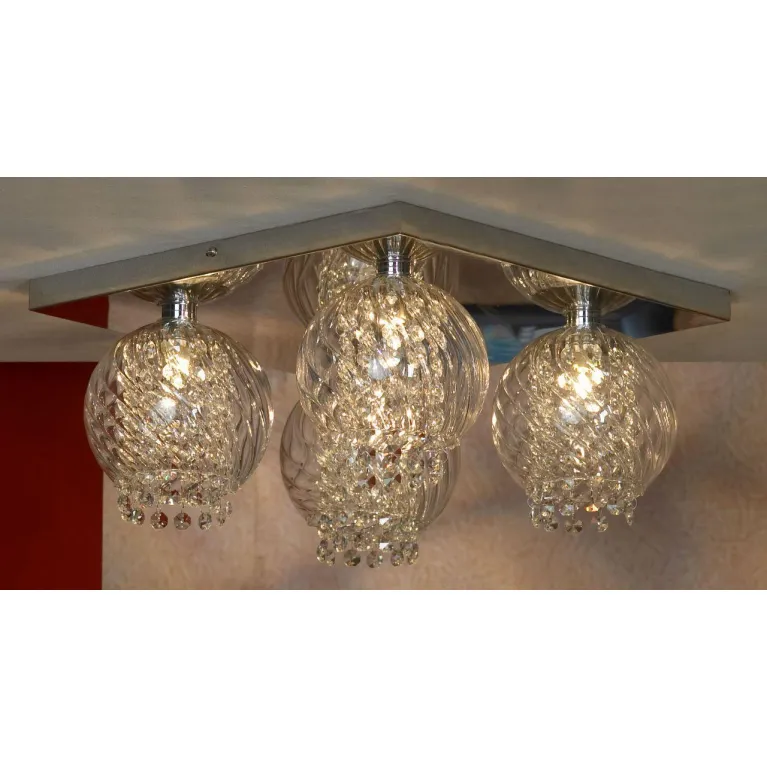 Преобладающий цвет люстры: Хром, плафонов: Прозрачный, арматуры: Хром; материал изготовления арматуры: Металл, размеры, мм: / ширина 400 / высота 190 Общая мощность – 160 Ватт, а максимальная площадь освещения до 8,9 м2. Основной тип ламп, предусмотренный производителем: Галогеновая с цоколем G9. В зависимости от предпочтений можно использовать лампы теплового, холодного или нейтрального света, за исключением люстр с типом цоколя LED.