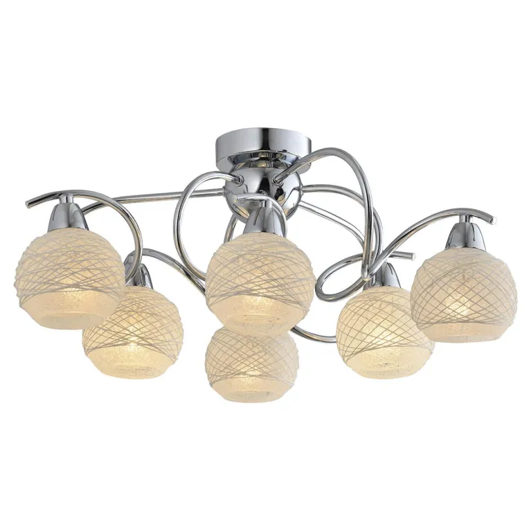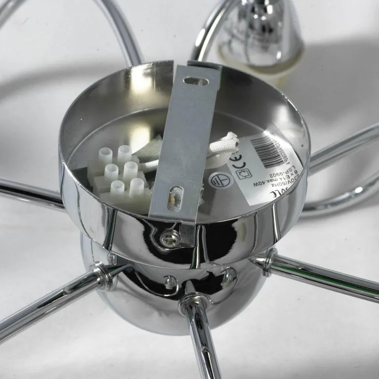 Преобладающий цвет люстры: Белый, плафонов: Белый, арматуры: Хром; материал изготовления арматуры: Металл, размеры, мм: / высота 250 / диаметр 620. Общая мощность – 240 Ватт, а максимальная площадь освещения до 13,3 м2. Основной тип ламп, предусмотренный производителем: Накаливания с цоколем E14. В зависимости от предпочтений можно использовать лампы теплового, холодного или нейтрального света, за исключением люстр с типом цоколя LED.