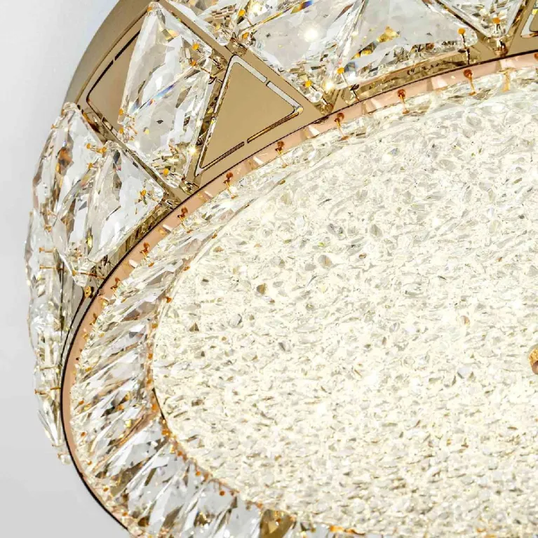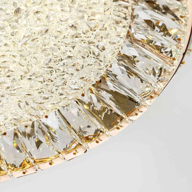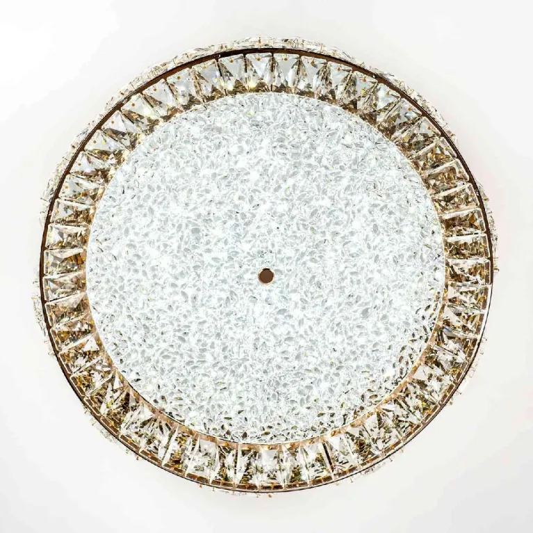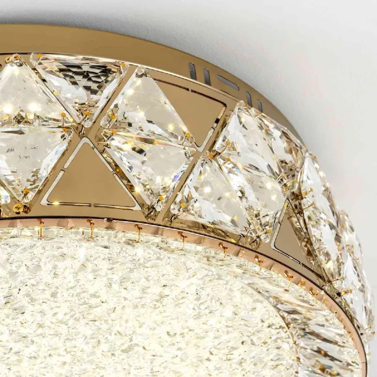 Преобладающий цвет плафонов: Прозрачный, арматуры: Золото; материал изготовления арматуры: Металл, размеры, мм: / высота 160 / диаметр 500. Общая мощность – 100 Ватт. Основной тип ламп, предусмотренный производителем: Светодиодная с цоколем LED. В зависимости от предпочтений можно использовать лампы теплового, холодного или нейтрального света, за исключением люстр с типом цоколя LED.