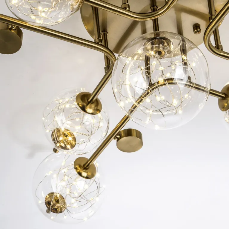 Преобладающий цвет плафонов: Прозрачный, арматуры: Бронза; материал изготовления арматуры: Металл, размеры, мм: / высота 260 / диаметр 1050. Общая мощность – 50 Ватт. Основной тип ламп, предусмотренный производителем: Светодиодная с цоколем LED. В зависимости от предпочтений можно использовать лампы теплового, холодного или нейтрального света, за исключением люстр с типом цоколя LED.