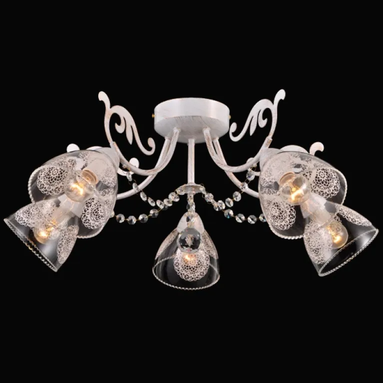 Люстра оснащена пятью источниками света с цоколем E14, что позволяет использовать лампы различных типов и мощности. Она изготовлена из прочного металла и покрыта белым матовым лаком, благодаря чему выглядит стильно и современно. Плафоны выполнены из белого матового стекла, которое обеспечивает мягкое и равномерное рассеивание света.