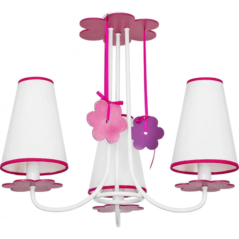 Преобладающий цвет люстры: Белый, плафонов: Белый, арматуры: Розовый; материал изготовления арматуры: Металл, размеры, мм: / высота 550 / диаметр 550. Общая мощность – 120 Ватт, а максимальная площадь освещения до 6,7 м2. Основной тип ламп, предусмотренный производителем: Накаливания с цоколем E14. В зависимости от предпочтений можно использовать лампы теплового, холодного или нейтрального света, за исключением люстр с типом цоколя LED.