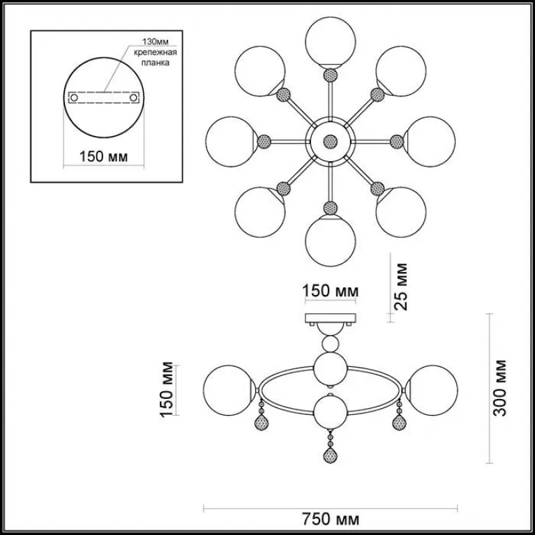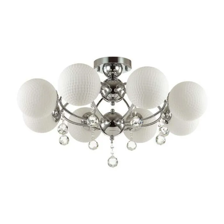 Преобладающий цвет люстры: Белый, плафонов: Белый, арматуры: Хром; материал изготовления арматуры: Металл, размеры, мм: / высота 400 / диаметр 750. Общая мощность – 480 Ватт, а максимальная площадь освещения до 26,7 м2. Основной тип ламп, предусмотренный производителем: Накаливания с цоколем E27. В зависимости от предпочтений можно использовать лампы теплового, холодного или нейтрального света, за исключением люстр с типом цоколя LED.