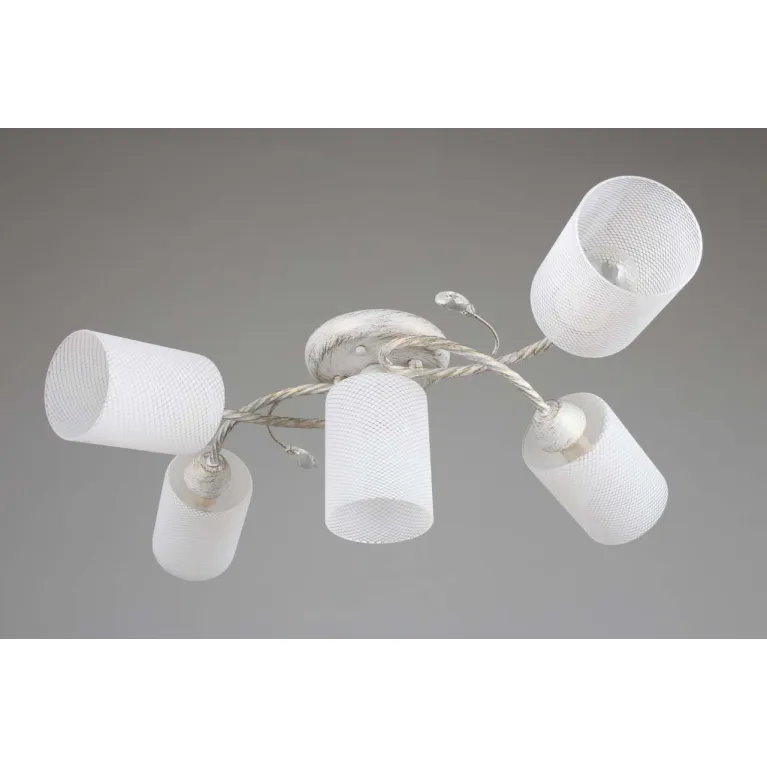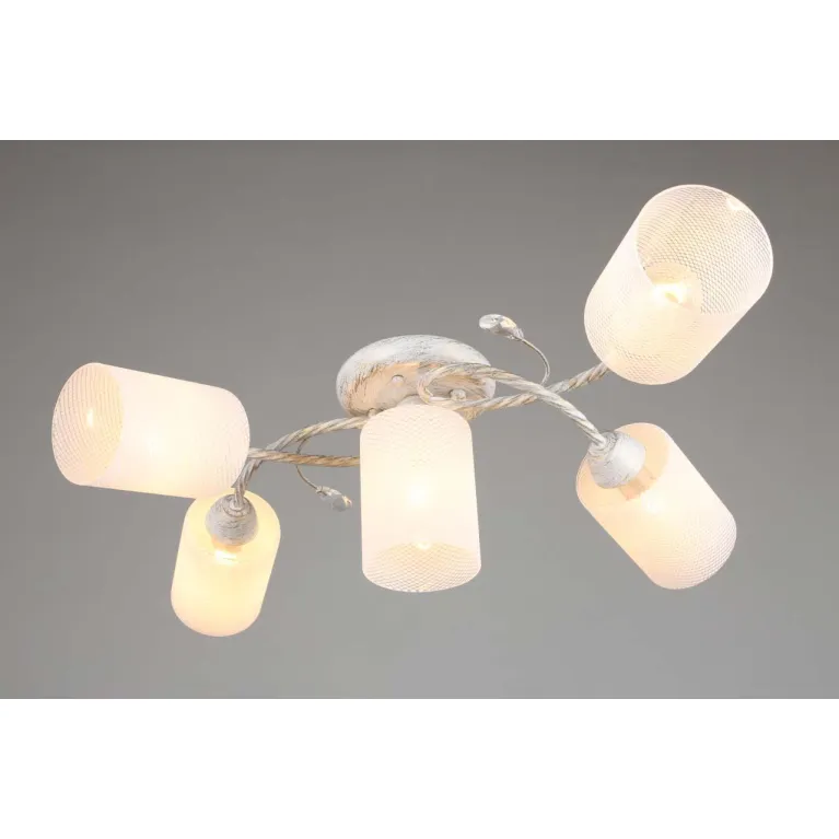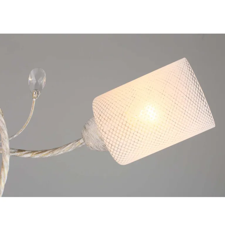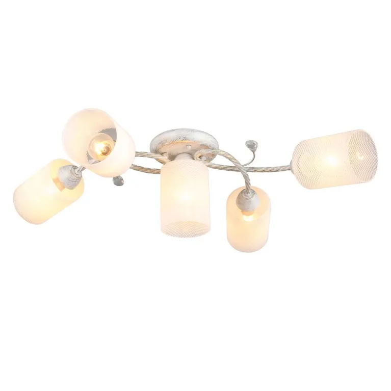 Преобладающий цвет люстры: Белый, плафонов: Белый, арматуры: Белое золото; материал изготовления арматуры: Металл, размеры, мм: / ширина 450 / высота 180 Общая мощность – 200 Ватт. Основной тип ламп, предусмотренный производителем: Накаливания с цоколем E14. В зависимости от предпочтений можно использовать лампы теплового, холодного или нейтрального света, за исключением люстр с типом цоколя LED.