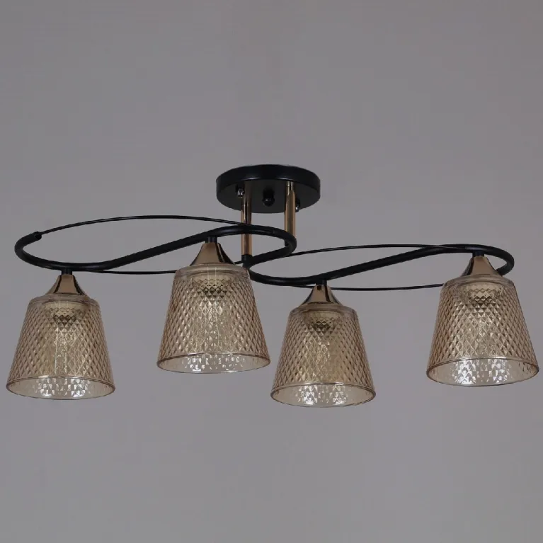 Преобладающий цвет плафонов: Янтарный, арматуры: Черный; материал изготовления арматуры: Металл, размеры, мм: длина 560 / ширина 260 / высота 230 Общая мощность – 160 Ватт, а максимальная площадь освещения до 24 м2. Основной тип ламп, предусмотренный производителем: Накаливания с цоколем E27. В зависимости от предпочтений можно использовать лампы теплового, холодного или нейтрального света, за исключением люстр с типом цоколя LED.