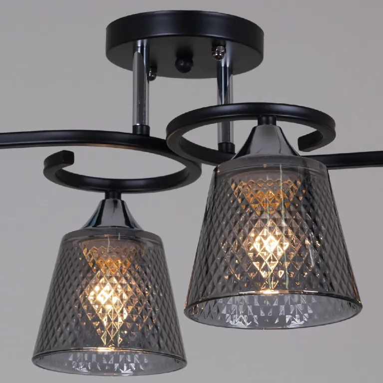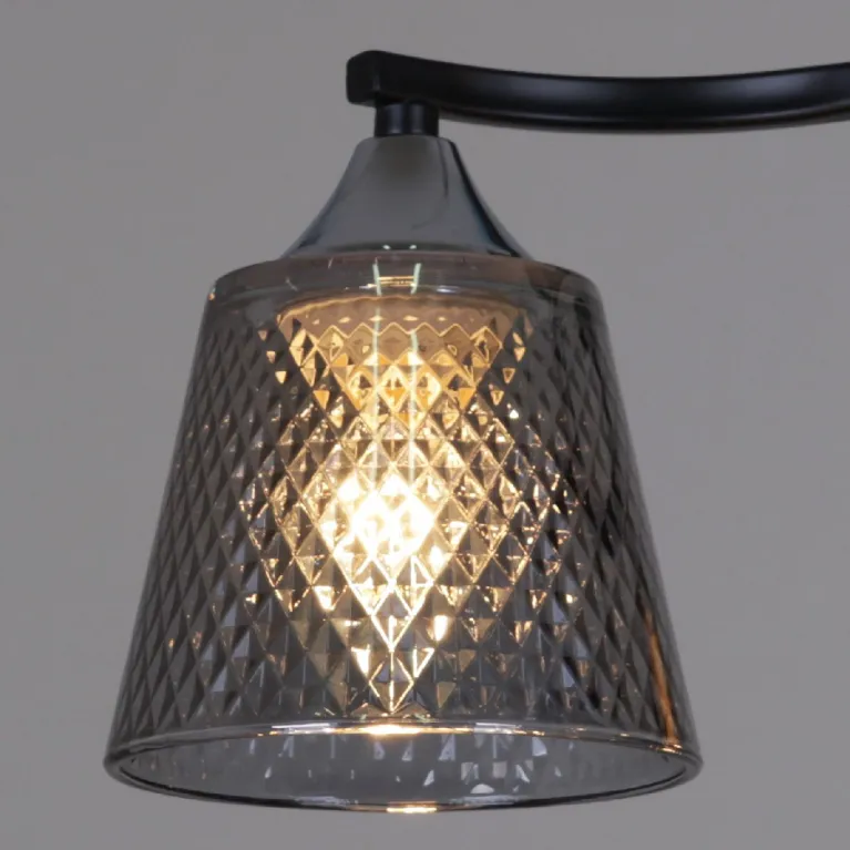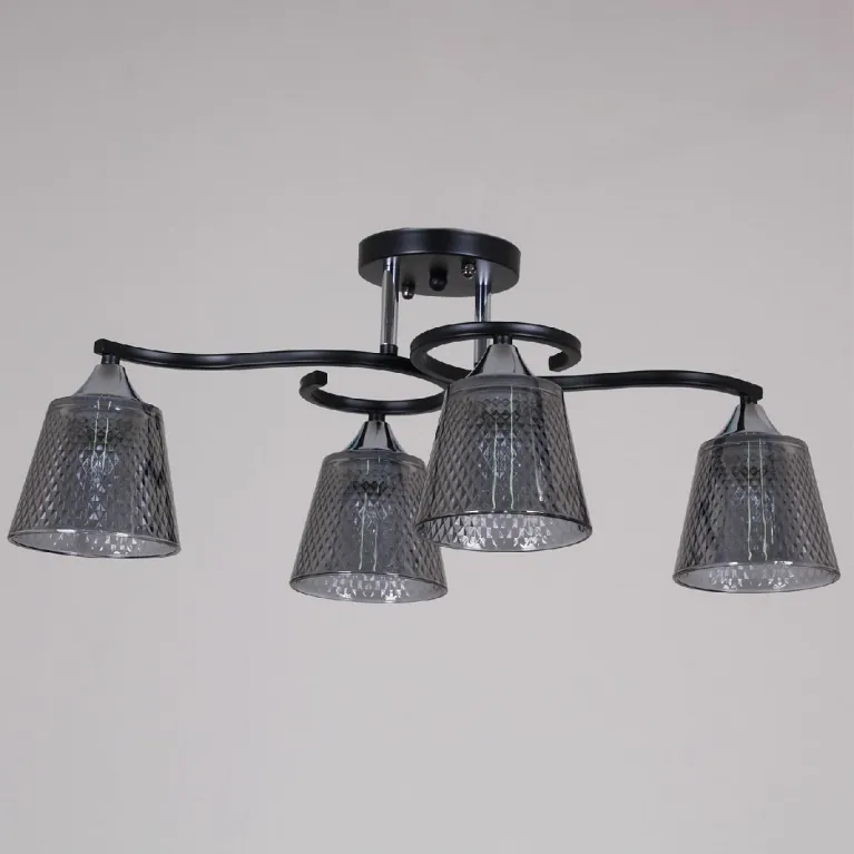 Преобладающий цвет плафонов: Дымчатый, арматуры: Черный; материал изготовления арматуры: Металл, размеры, мм: длина 590 / ширина 360 / высота 230 Общая мощность – 160 Ватт, а максимальная площадь освещения до 24 м2. Основной тип ламп, предусмотренный производителем: Накаливания с цоколем E27. В зависимости от предпочтений можно использовать лампы теплового, холодного или нейтрального света, за исключением люстр с типом цоколя LED.