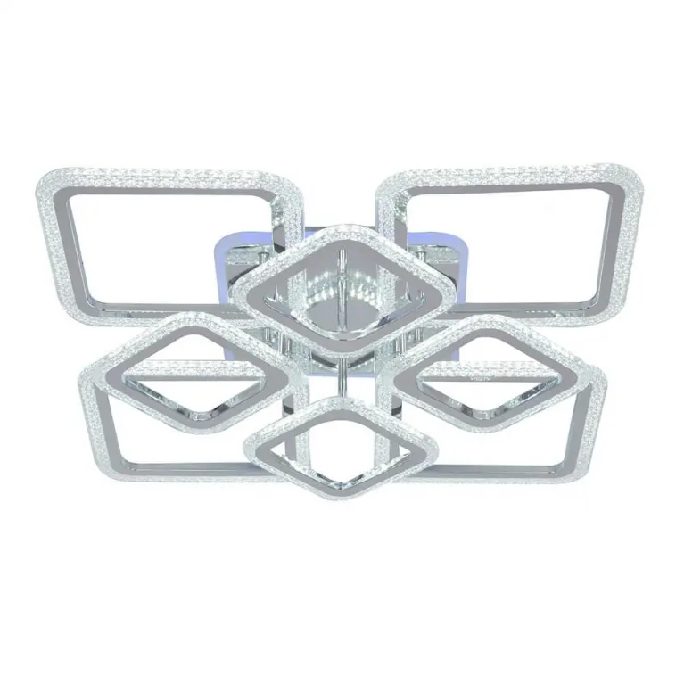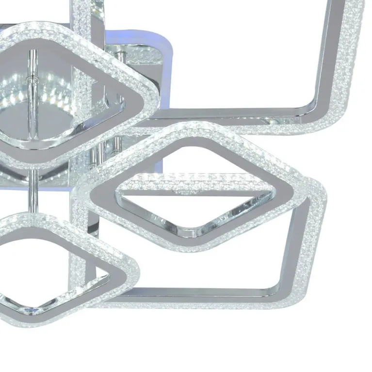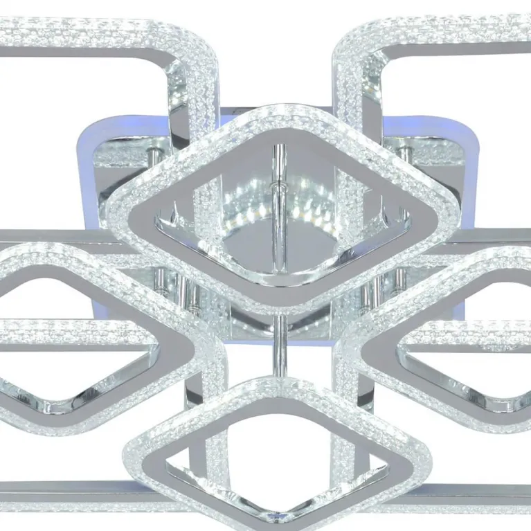 Преобладающий цвет люстры: Хром, плафонов: Хром, арматуры: Хром; материал изготовления арматуры: Металл, размеры, мм: длина 590 / ширина 590 / высота 125 Общая мощность – 1575 Ватт, а максимальная площадь освещения до 40 м2. Основной тип ламп, предусмотренный производителем: Светодиодная с цоколем LED. В зависимости от предпочтений можно использовать лампы теплового, холодного или нейтрального света, за исключением люстр с типом цоколя LED.