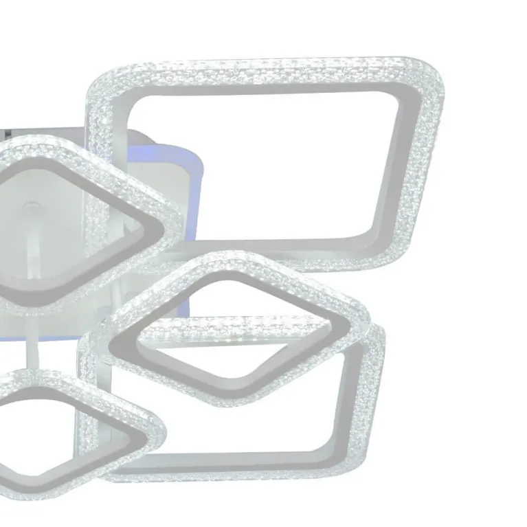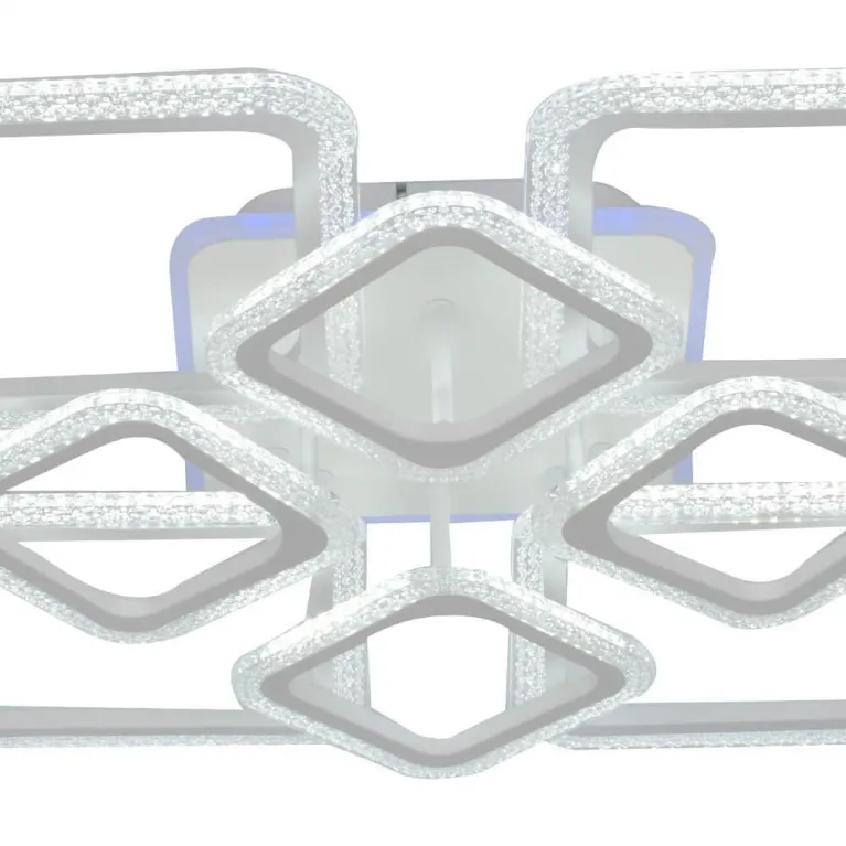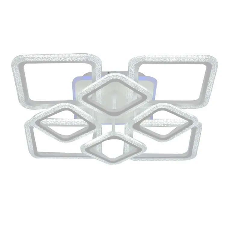 Преобладающий цвет люстры: Белый, плафонов: Белый, арматуры: Белый; материал изготовления арматуры: Металл, размеры, мм: длина 590 / ширина 590 / высота 125 Общая мощность – 1395 Ватт, а максимальная площадь освещения до 35 м2. Основной тип ламп, предусмотренный производителем: Светодиодная с цоколем LED. В зависимости от предпочтений можно использовать лампы теплового, холодного или нейтрального света, за исключением люстр с типом цоколя LED.