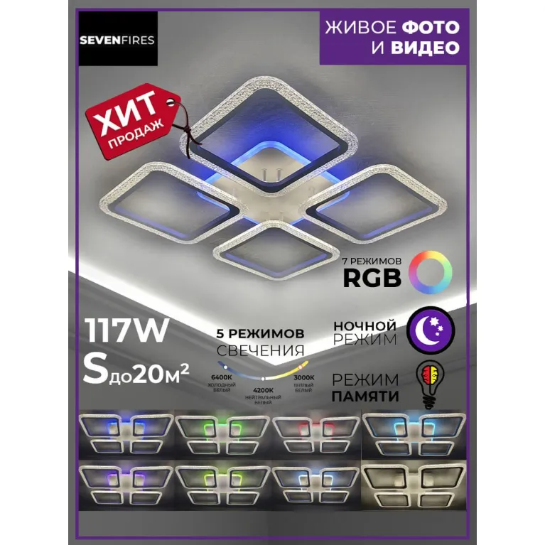 Люстра Seven Fires Tomiris оснащена светодиодной RGB-подсветкой, которая добавляет в интерьер динамики и современного стиля. Она может менять цвет и интенсивность света, создавая уникальное и запоминающееся освещение, подходящее для различных задач и настроений.