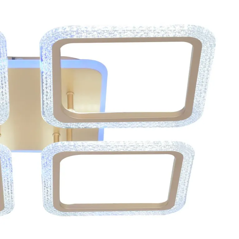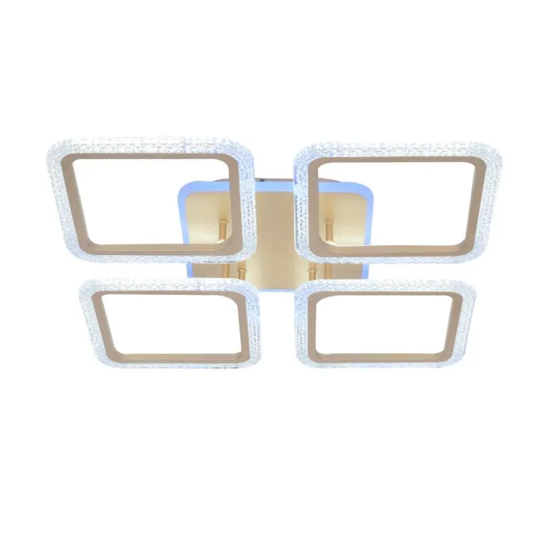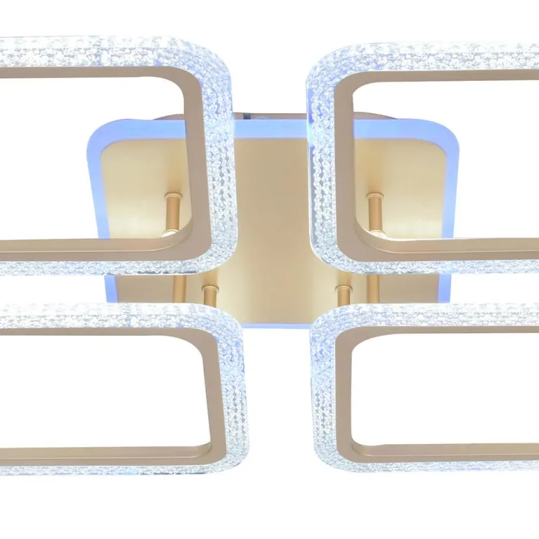 Преобладающий цвет люстры: Шампань, плафонов: Шампань, арматуры: Шампань; материал изготовления арматуры: Металл, размеры, мм: длина 570 / ширина 570 / высота 85 Общая мощность – 500 Ватт, а максимальная площадь освещения до 25 м2. Основной тип ламп, предусмотренный производителем: Светодиодная с цоколем LED. В зависимости от предпочтений можно использовать лампы теплового, холодного или нейтрального света, за исключением люстр с типом цоколя LED.