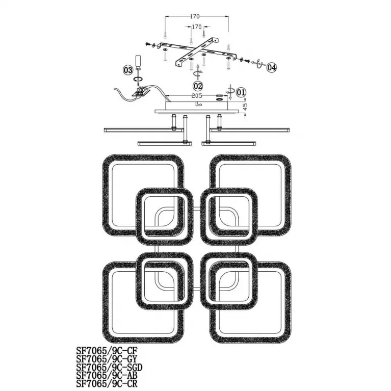 Преобладающий цвет люстры: Коричневый, плафонов: Коричневый, арматуры: Коричневый; материал изготовления арматуры: Металл, размеры, мм: длина 590 / ширина 590 / высота 125 Общая мощность – 1395 Ватт, а максимальная площадь освещения до 35 м2. Основной тип ламп, предусмотренный производителем: Светодиодная с цоколем LED. В зависимости от предпочтений можно использовать лампы теплового, холодного или нейтрального света, за исключением люстр с типом цоколя LED.