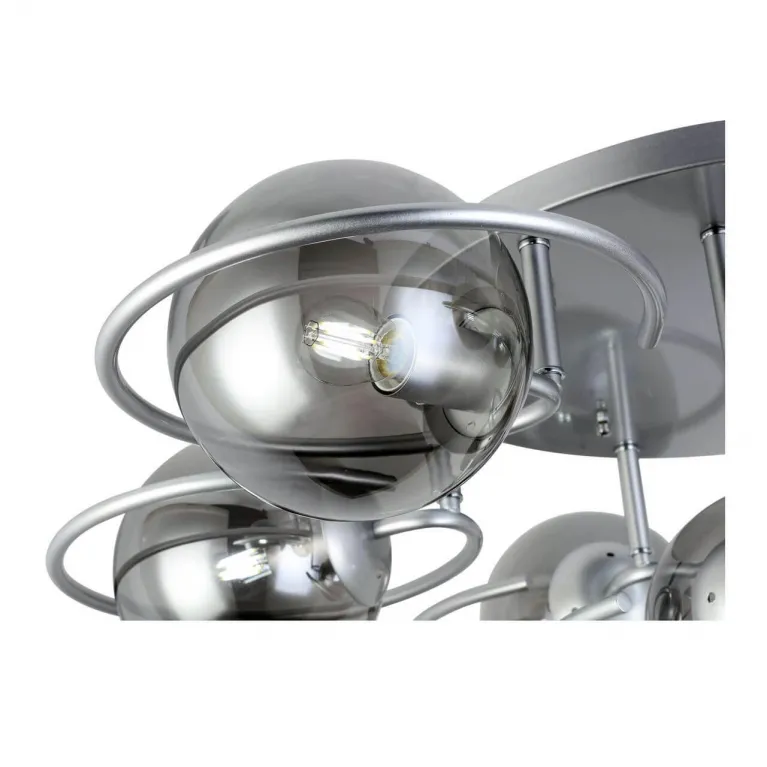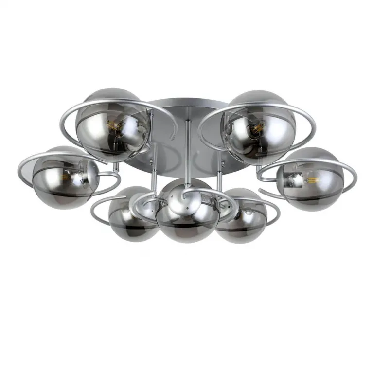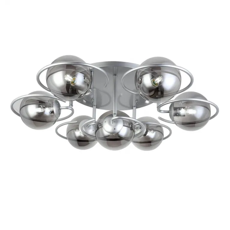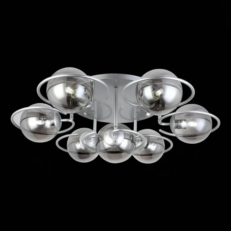 Преобладающий цвет люстры: Дымчатый, плафонов: Дымчатый, арматуры: Серебро; материал изготовления арматуры: Металл, размеры, мм: / высота 300 / диаметр 930. Общая мощность – 420 Ватт, а максимальная площадь освещения до 21 м2. Основной тип ламп, предусмотренный производителем: Накаливания с цоколем E27. В зависимости от предпочтений можно использовать лампы теплового, холодного или нейтрального света, за исключением люстр с типом цоколя LED.