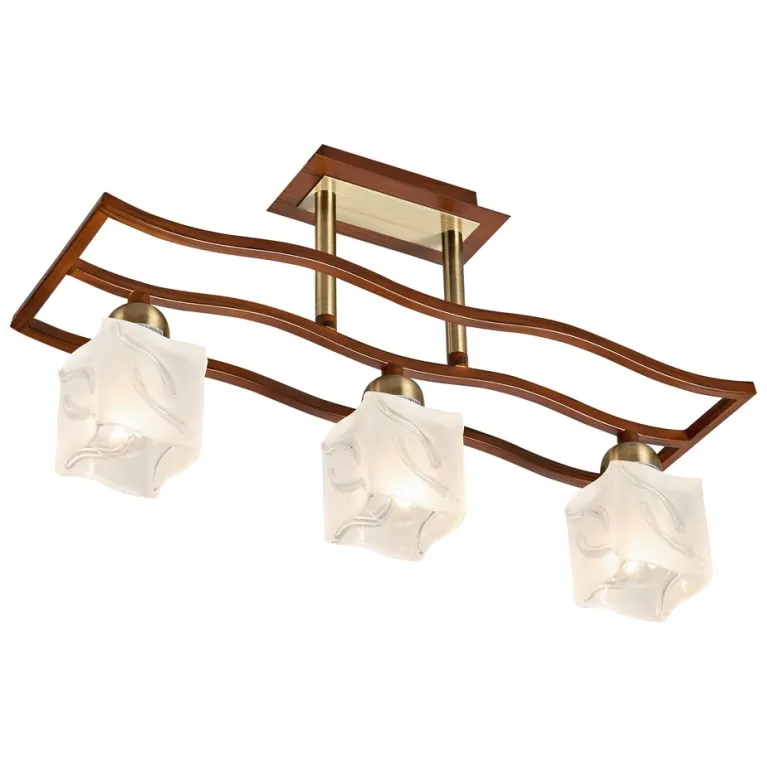 Преобладающий цвет плафонов: Белый, арматуры: Коричневый; материал изготовления арматуры: Металл, размеры, мм: длина 480 / ширина 150 / высота 280 Общая мощность – 120 Ватт, а максимальная площадь освещения до 6 м2. Основной тип ламп, предусмотренный производителем: Накаливания с цоколем E14. В зависимости от предпочтений можно использовать лампы теплового, холодного или нейтрального света, за исключением люстр с типом цоколя LED.