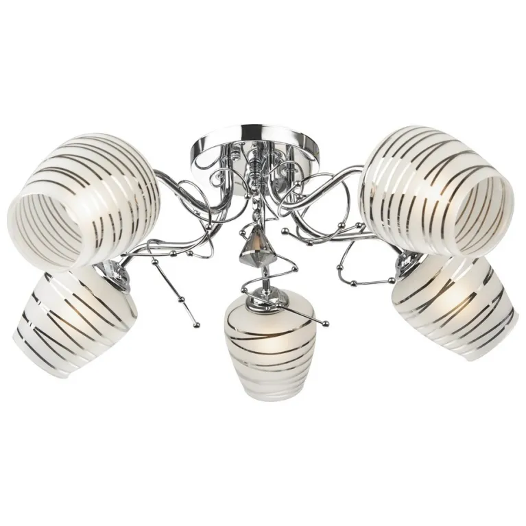 Преобладающий цвет плафонов: Белый, арматуры: Хром; материал изготовления арматуры: Металл, размеры, мм: / высота 300 / диаметр 550. Общая мощность – 300 Ватт, а максимальная площадь освещения до 15 м2. Основной тип ламп, предусмотренный производителем: Накаливания с цоколем E27. В зависимости от предпочтений можно использовать лампы теплового, холодного или нейтрального света, за исключением люстр с типом цоколя LED.