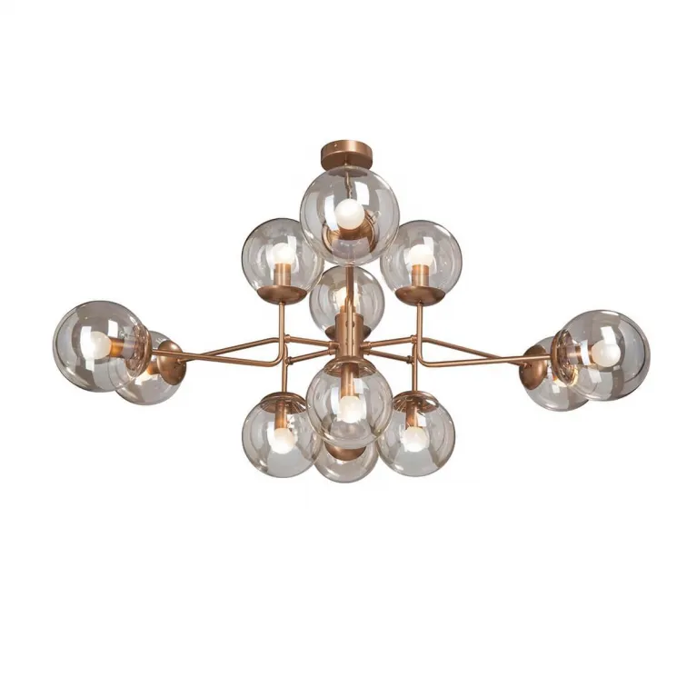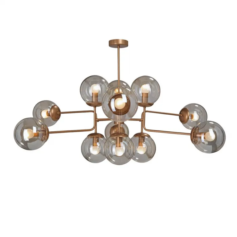 Светильник выполнен из прочного металла и имеет элегантное декоративное покрытие. Плафоны изготовлены из качественного матового стекла, которое прекрасно рассеивает свет и создает мягкое и равномерное освещение. Люстра имеет 12 рожков, что обеспечивает достаточный уровень яркости и позволяет осветить большую площадь помещения.