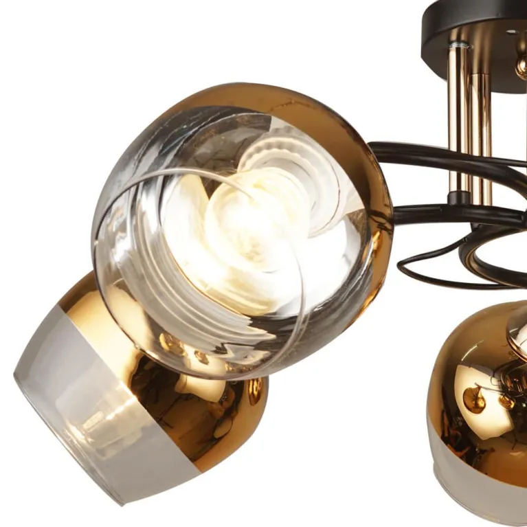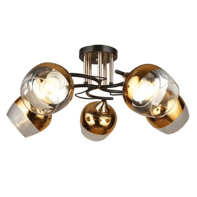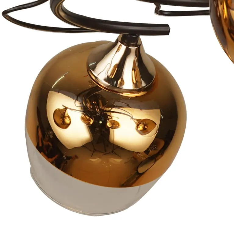 Преобладающий цвет люстры: Золотой, плафонов: Золотой, арматуры: Черный; материал изготовления арматуры: Металл, размеры, мм: / высота 230 / диаметр 560. Общая мощность – 300 Ватт, а максимальная площадь освещения до 16,7 м2. Основной тип ламп, предусмотренный производителем: Накаливания с цоколем E27. В зависимости от предпочтений можно использовать лампы теплового, холодного или нейтрального света, за исключением люстр с типом цоколя LED.