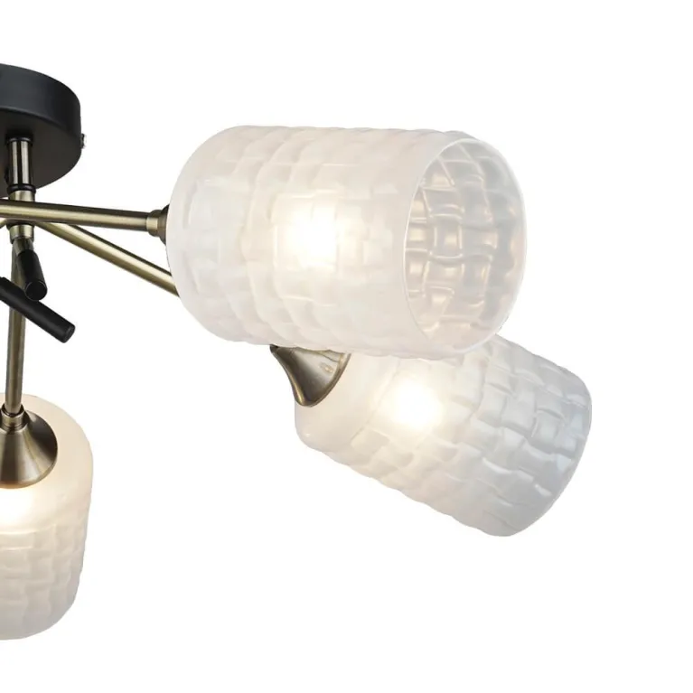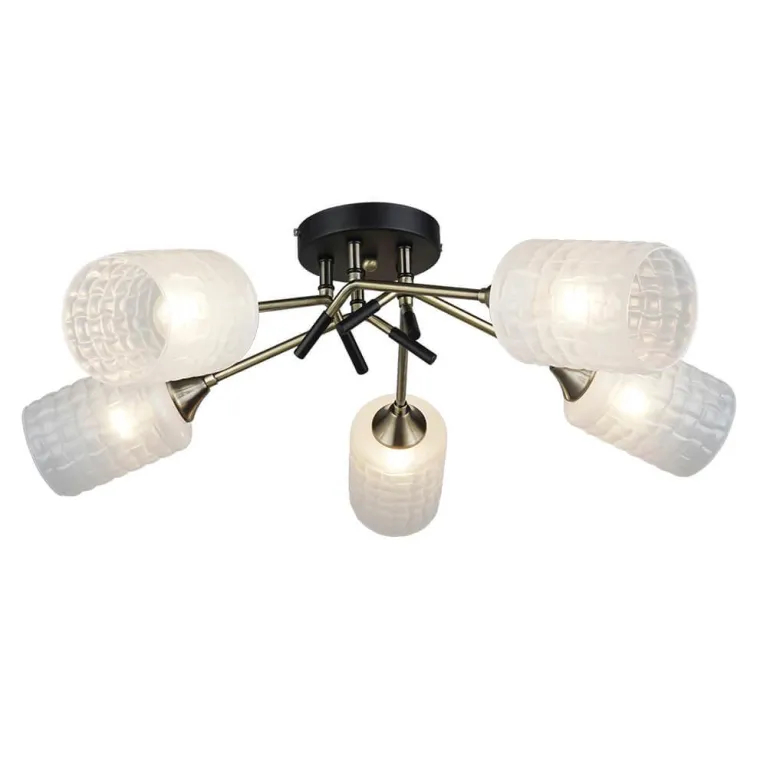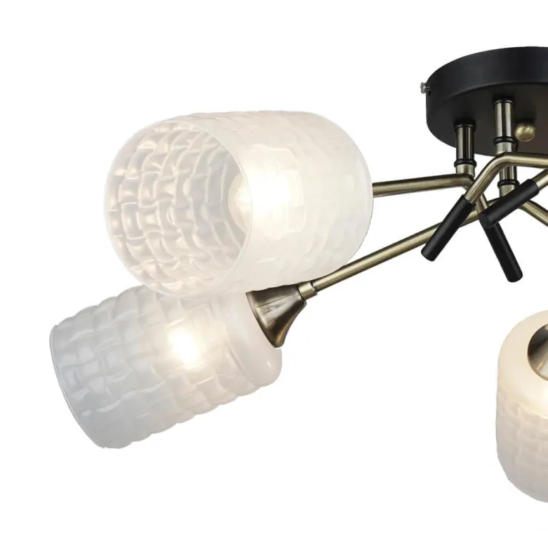 Преобладающий цвет люстры: Античная бронза, плафонов: Белый, арматуры: Античная бронза; материал изготовления арматуры: Металл, размеры, мм: / высота 235 / диаметр 640. Общая мощность – 300 Ватт, а максимальная площадь освещения до 15 м2. Основной тип ламп, предусмотренный производителем: Накаливания с цоколем E27. В зависимости от предпочтений можно использовать лампы теплового, холодного или нейтрального света, за исключением люстр с типом цоколя LED.