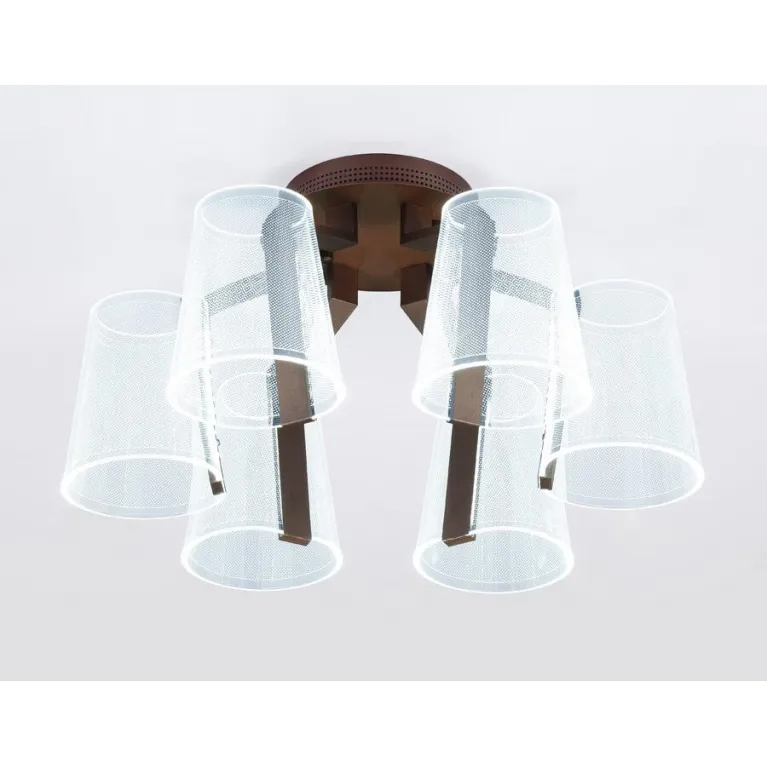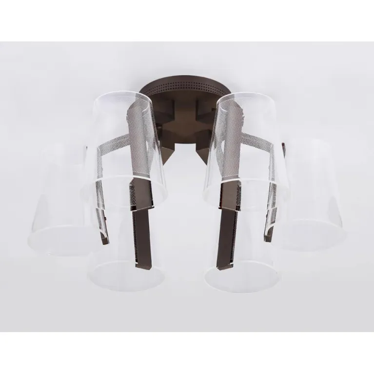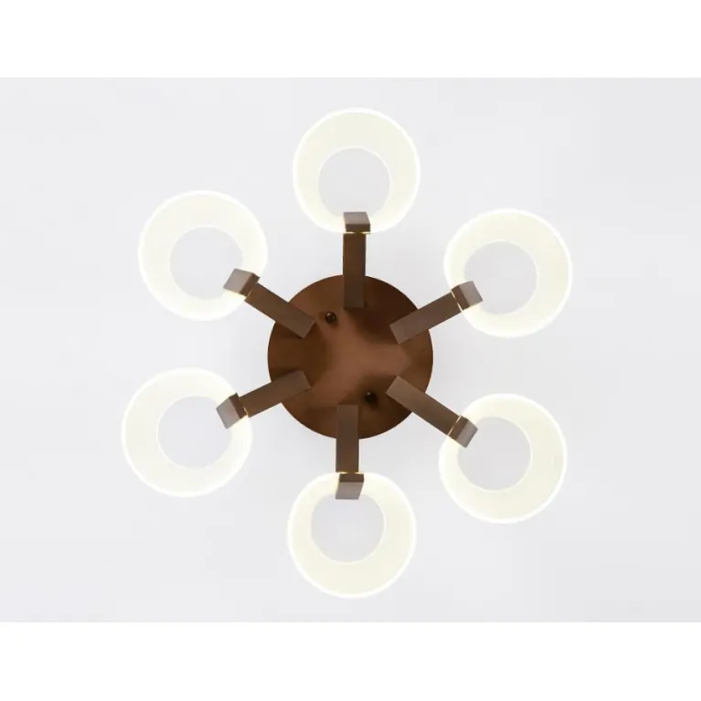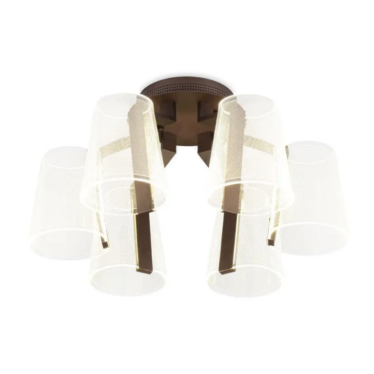Преобладающий цвет люстры: Кофейный, плафонов: Прозрачный, арматуры: Кофейный; материал изготовления арматуры: Металл, размеры, мм: / высота 290 / диаметр 600. Общая мощность – 96 Ватт, а максимальная площадь освещения до 20 м2. Основной тип ламп, предусмотренный производителем: Светодиодная с цоколем LED. В зависимости от предпочтений можно использовать лампы теплового, холодного или нейтрального света, за исключением люстр с типом цоколя LED.
