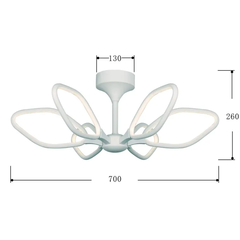 Преобладающий цвет люстры: Белый, плафонов: Белый, арматуры: Белый; материал изготовления арматуры: Металл, размеры, мм: / высота 260 / диаметр 700. Общая мощность – 72 Ватт. Основной тип ламп, предусмотренный производителем: Светодиодная с цоколем LED. В зависимости от предпочтений можно использовать лампы теплового, холодного или нейтрального света, за исключением люстр с типом цоколя LED.