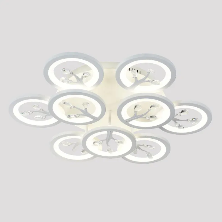 Преобладающий цвет люстры: Белый, плафонов: Белый, арматуры: Белый; материал изготовления арматуры: Металл, размеры, мм: / высота 130 / диаметр 680. Общая мощность – 198 Ватт, а максимальная площадь освещения до 20 м2. Основной тип ламп, предусмотренный производителем: Светодиодная с цоколем LED. В зависимости от предпочтений можно использовать лампы теплового, холодного или нейтрального света, за исключением люстр с типом цоколя LED.