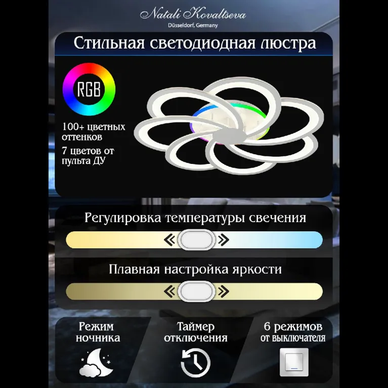 Люстра изготовлена из высококачественных материалов, что гарантирует её долговечность и надёжность. Светодиоды отличаются низким энергопотреблением и длительным сроком службы, что делает эту люстру не только красивой, но и экономичной.