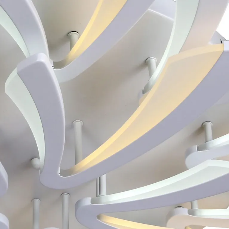 Преобладающий цвет люстры: Белый, плафонов: Белый, арматуры: Белый; материал изготовления арматуры: Металл, размеры, мм: / высота 120 / диаметр 1050. Общая мощность – 150 Ватт, а максимальная площадь освещения до 100 м2. Основной тип ламп, предусмотренный производителем: Светодиодная с цоколем LED. В зависимости от предпочтений можно использовать лампы теплового, холодного или нейтрального света, за исключением люстр с типом цоколя LED.