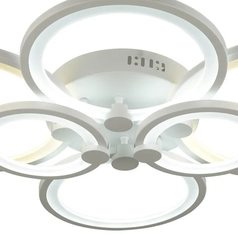Преобладающий цвет люстры: Белый, плафонов: Белый, арматуры: Белый; материал изготовления арматуры: Металл, размеры, мм: длина 800 / ширина 590 / высота 100 Общая мощность – 564 Ватт, а максимальная площадь освещения до 30 м2. Основной тип ламп, предусмотренный производителем: Светодиодная с цоколем LED. В зависимости от предпочтений можно использовать лампы теплового, холодного или нейтрального света, за исключением люстр с типом цоколя LED.