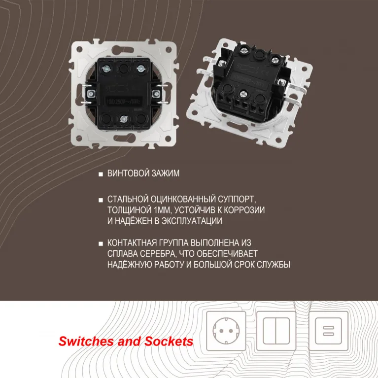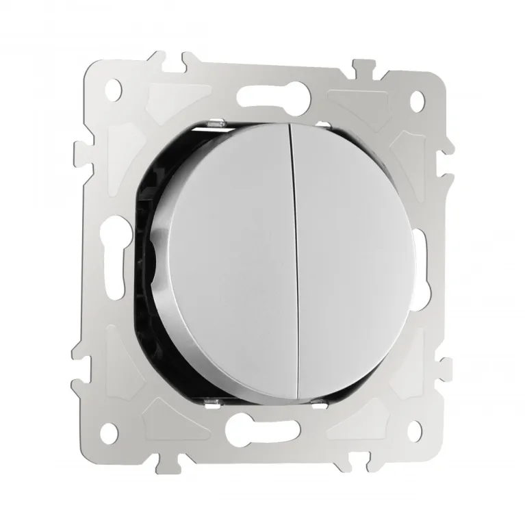 Материал корпуса выключателя — металл, который обеспечивает долговечность и надёжность устройства. Его серебристый цвет придаст вашему интерьеру современный и элегантный вид.