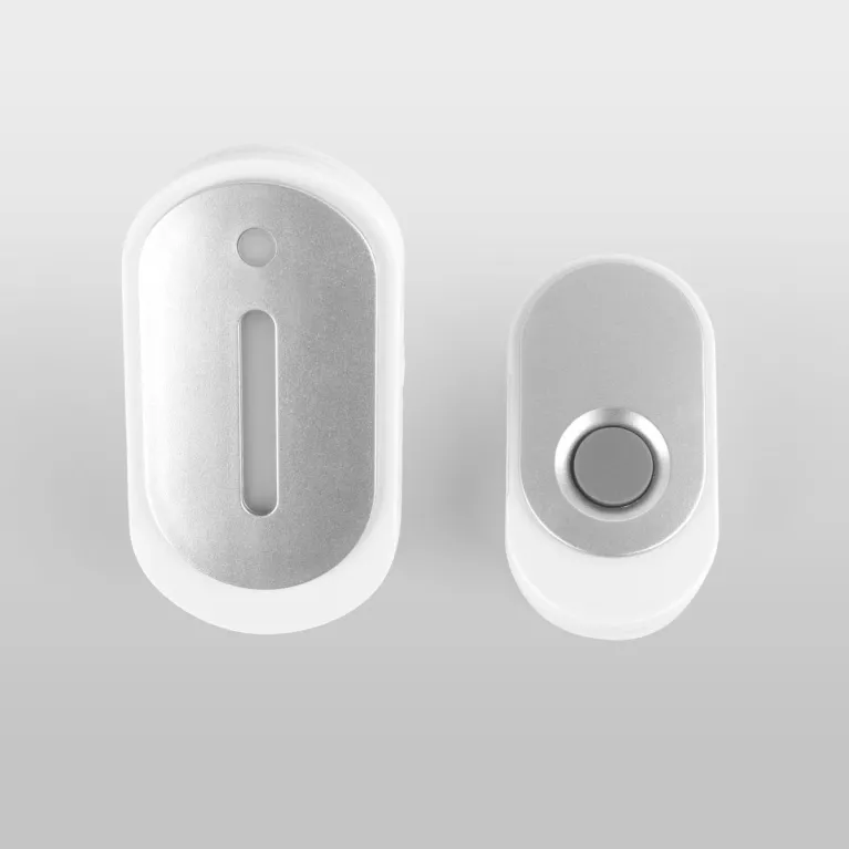 Корпус звонка выполнен из прочного пластика с элегантным серебристым покрытием, что придаёт изделию современный и эстетически привлекательный вид. Устройство оснащено технологией беспроводной связи, благодаря чему установка звонка не требует прокладки кабелей и занимает минимальное время.