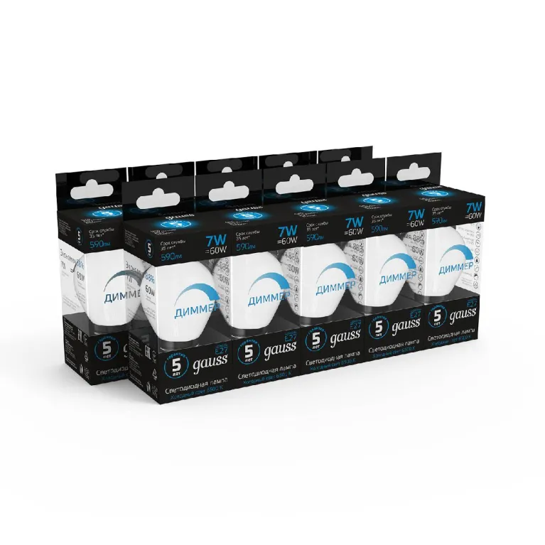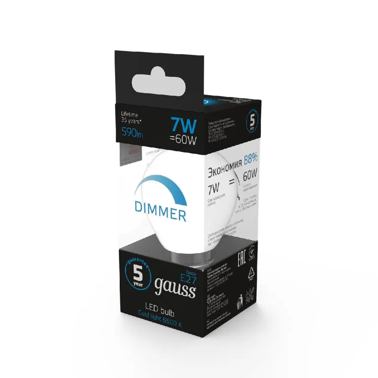 Лампа светодиодная диммируемая Gauss E27 7W 6500K шар матовый 105102307-D российского производителя Gauss будет долго служить владельцу, бесперебойно выполняя свои функции. Моделью просто пользоваться. При заказе в интернет-магазине «Иллюзия света» цена – 319 ₽.