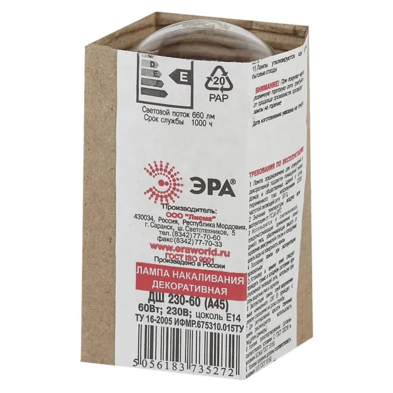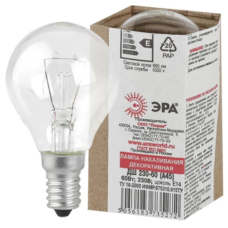 Лампа накаливания ЭРА E14 60W 2700K прозрачная P45-60W-E14/ДШ 230-60 Е 14 (гофра) российского производителя ЭРА будет долго служить владельцу, бесперебойно выполняя свои функции. Моделью просто пользоваться. При заказе в интернет-магазине «Иллюзия света» цена – 30 ₽.