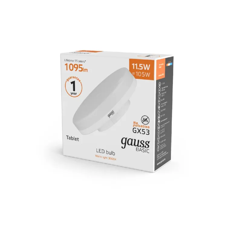 Лампа светодиодная Gauss GX53 11,5W 3000К матовая 20849112 российского производителя Gauss будет долго служить владельцу, бесперебойно выполняя свои функции. Моделью просто пользоваться. При заказе в интернет-магазине «Иллюзия света» цена – 225 ₽.