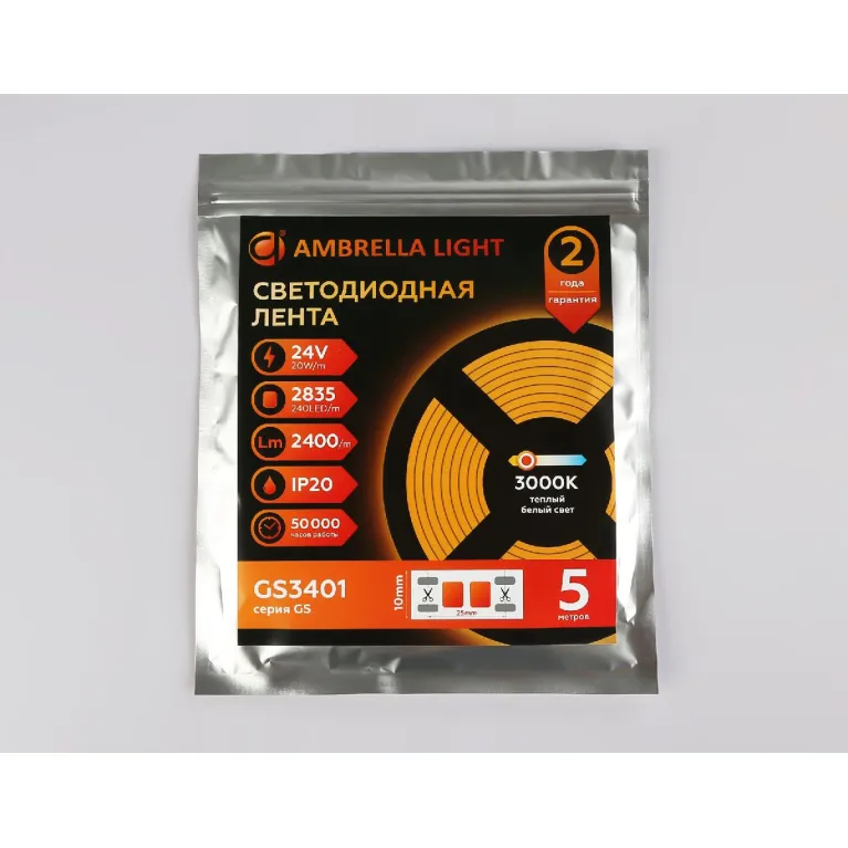 Светодиодная лента Ambrella Light LED Strip 24В 2835 20Вт/м 3000K 5м IP20 GS3401