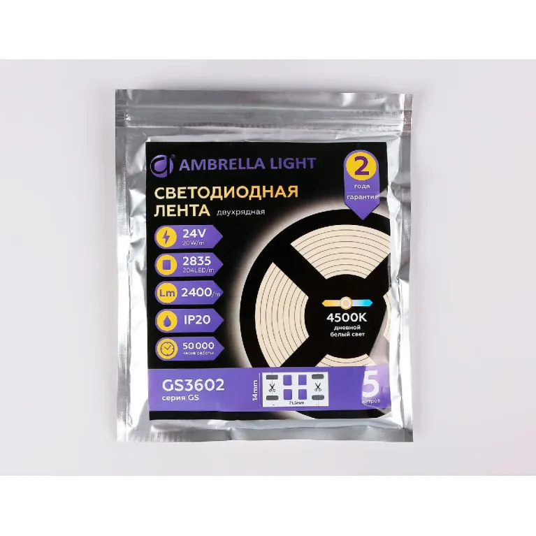 Светодиодная двухрядная лента Ambrella Light LED strip 24V 2835 20W — это универсальный осветительный прибор, который может использоваться для подсветки интерьера и экстерьера. Светодиодная лента представляет собой гибкую плату с диодами, которая легко монтируется на различные поверхности. Она может быть установлена в нишах, за карнизами, под шкафами и другими элементами интерьера. Также её можно использовать для наружной подсветки зданий, витрин, рекламных вывесок и т. д. Лента имеет нейтральный белый свет температурой 4500К, что создаёт приятную атмосферу в помещении. Степень защиты IP20 означает, что лента предназначена для использования внутри помещений с нормальной влажностью. Светодиодная лента работает от напряжения 24В, что обеспечивает безопасность при использовании. Длина ленты составляет 5 метров, что позволяет создавать различные световые эффекты. Мощность ленты составляет 20 Вт/м, что достаточно для яркого освещения.