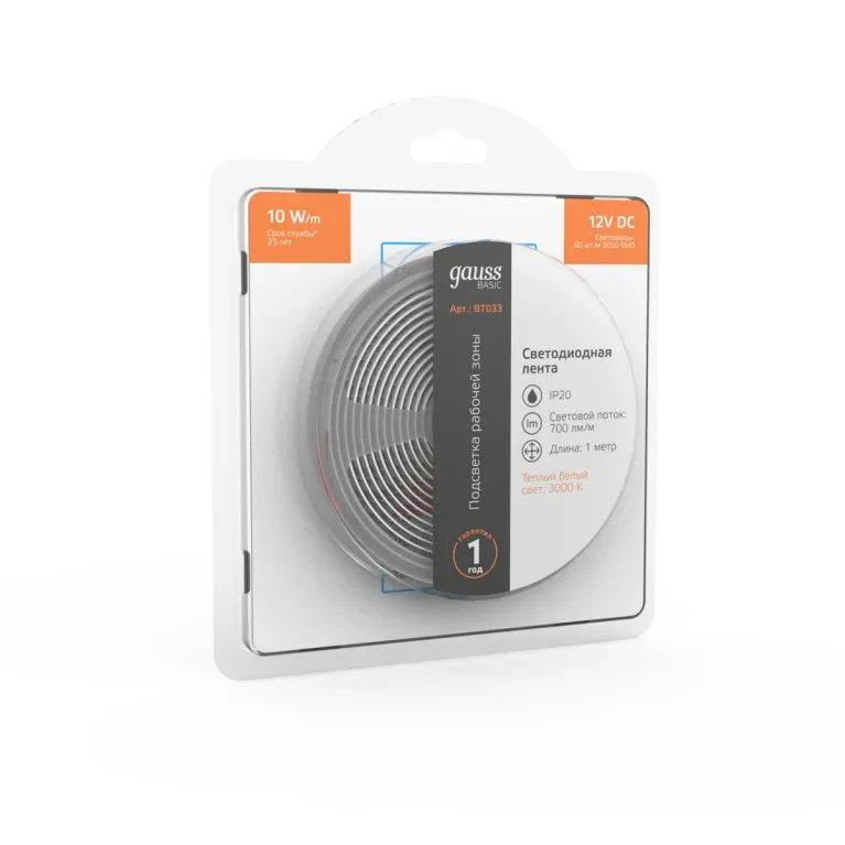 Светодиодная лента Gauss Basic 12В 5050 10Вт/м 3000K 1м IP20 BT033