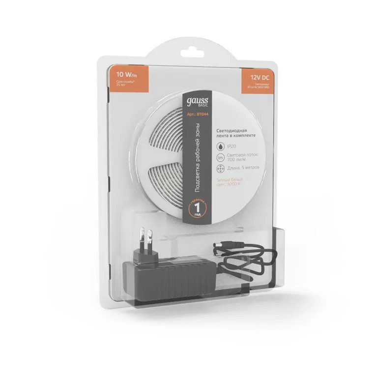 Светодиодная лента Gauss Basic 12В 5050 10Вт/м 3000K 5м IP20 BT044