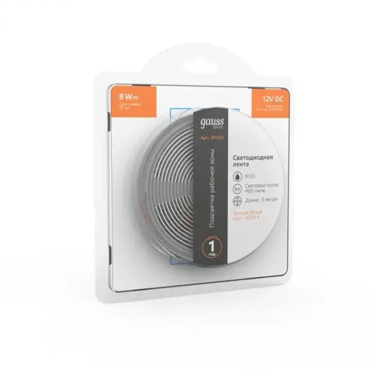 Светодиодная лента Gauss Basic 12В 5050 8Вт/м 3000K 3м IP20 BT022