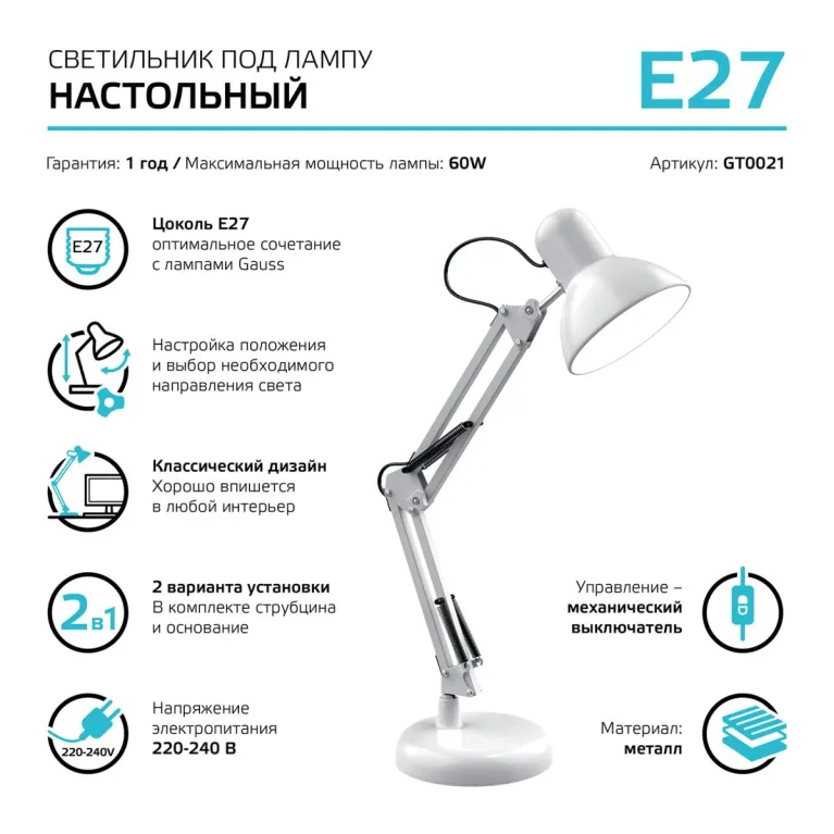 Настольная лампа Gauss GT0021 из коллекции GTL002 российского производителя Gauss гармонично впишется в интерьер, оформленный в современном стиле. Это элегантный и функциональный осветительный прибор для офиса. Материал, из которого сделан плафон белого цвета – металл. Для изготовления арматуры использован металл. Настольная лампа GT0021 привлекательно выглядит, защищена от пыли в соответствии со стандартом IP20 и будет долго служить владельцу. Цена этой модели при заказе в интернет-магазине «Иллюзия света» – 2 790 ₽.