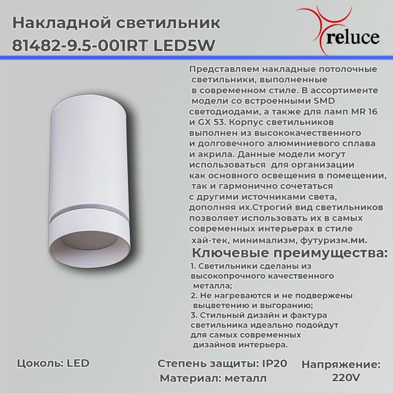 Накладной светильник Reluce 81482-95-001RT LED5W WT — это прекрасное решение для создания точечного освещения в любом помещении. Благодаря компактным размерам и универсальному дизайну, светильник легко впишется в любой интерьер и станет его гармоничным дополнением. Он идеально подойдёт для гостиной, спальни, кухни, детской, студии, прихожей. Светильник можно использовать для локальной подсветки зон и расстановки акцентов в интерьере. С его помощью вы сможете создать уютную атмосферу в вашем доме. Этот светильник также подойдёт для использования в общественных местах, таких как офисы, магазины, кафе и рестораны.