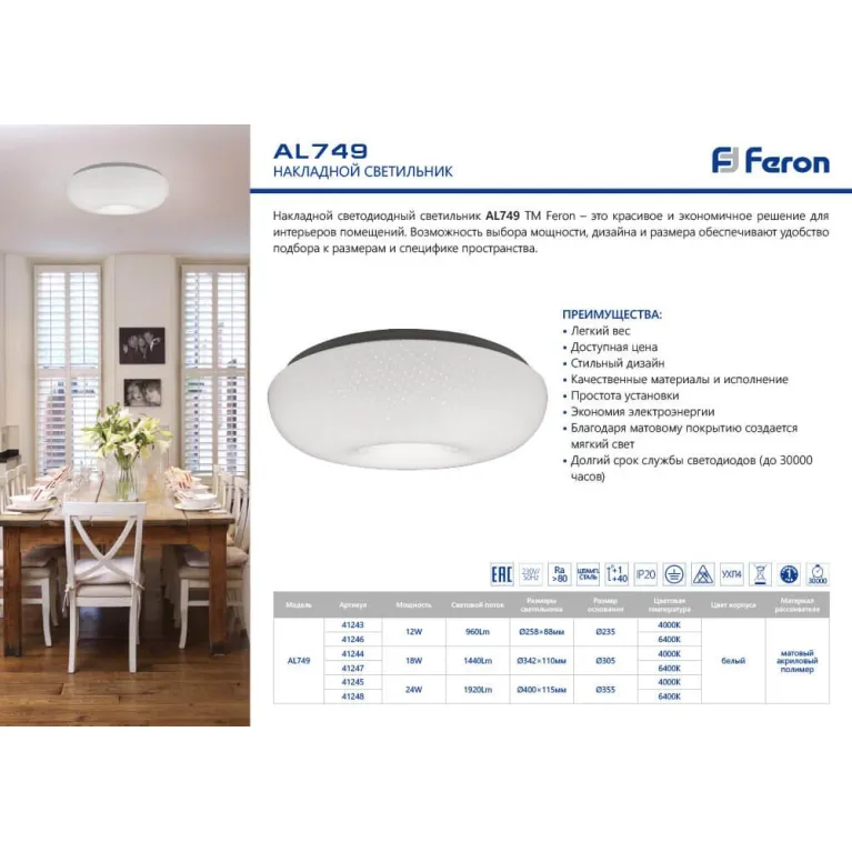 Потолочный светодиодный светильник Feron AL749 41247 из серии AL749 российского производителя Feron. В данном светильнике используются лампы с цоколем LED, суммарной мощностью 18 Вт. Модель оформлена в современном стиле и устанавливается на потолок. Она отлично подходит для кухни.