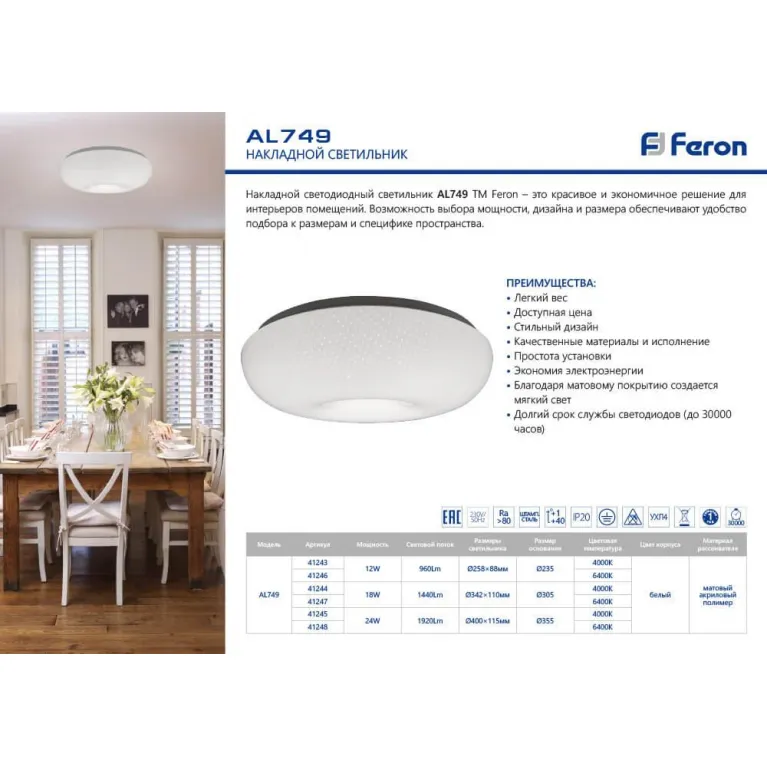 Потолочный светодиодный светильник Feron AL749 41248 из серии AL749 российского производителя Feron. В данном светильнике используются лампы с цоколем LED, суммарной мощностью 24 Вт. Модель оформлена в современном стиле и устанавливается на потолок. Она отлично подходит для кухни.