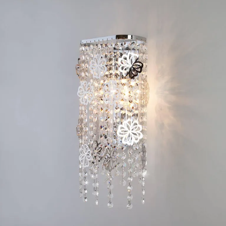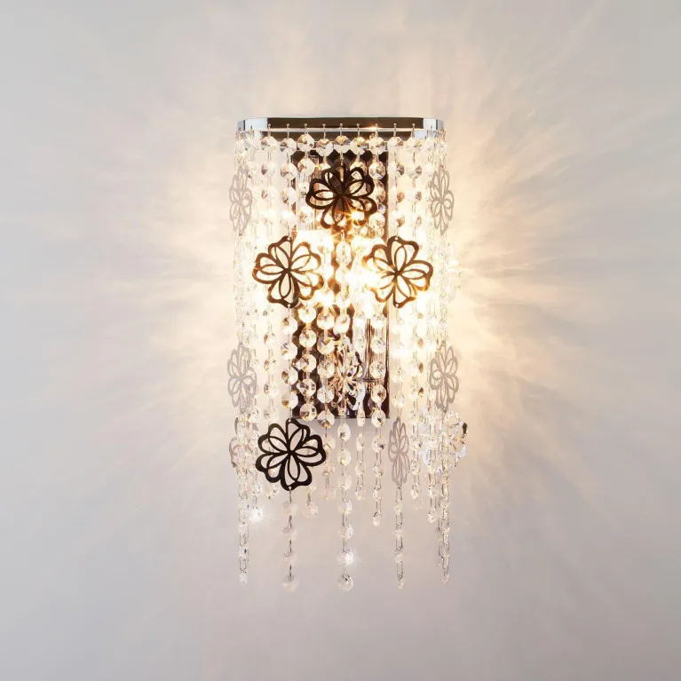 Бра Eurosvet 10083/2 хром/прозрачный хрусталь Strotskis из серии Flower российского производителя Eurosvet обеспечивает приятное для глаз освещение на площади 10 м2. В данном светильнике используются лампы с цоколем E14, суммарной мощностью 120 Вт. Модель оформлена в стиле модерн и устанавливается на стену. Она отлично подходит для гостиной.