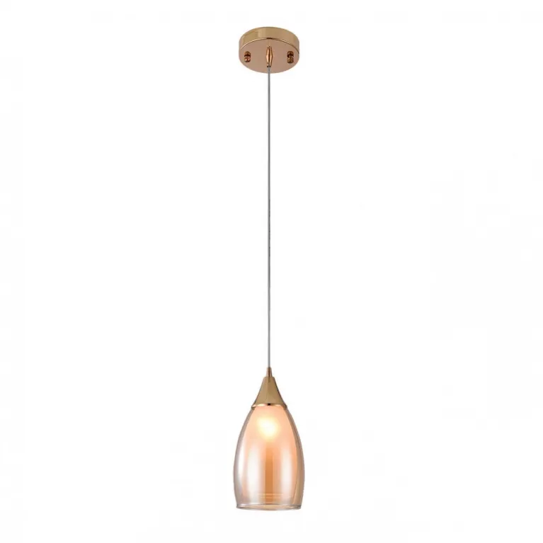 Корпус светильника изготовлен из прочного металла с эффектным золотым покрытием. Плафон выполнен из белого матового стекла, что обеспечивает мягкое и равномерное рассеивание света. Подвесной светильник совместим с лампами накаливания или энергосберегающими источниками света с цоколем E27, что позволяет выбрать подходящий уровень освещения в зависимости от потребностей.