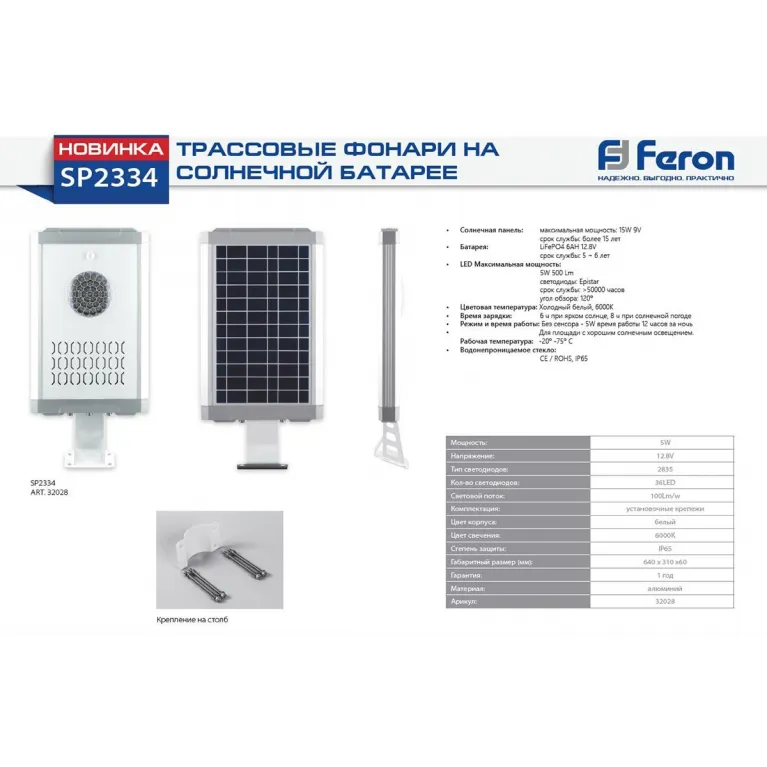Уличный светодиодный консольный светильник на солнечной батарее Feron SP2334 32028