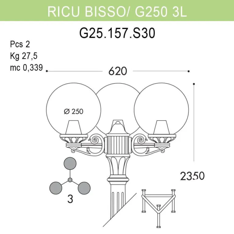 Уличный фонарь Fumagalli Ricu Bisso/G250 G25.157.S30.AZE27 итальянского производителя Fumagalli относится к коллекции «Ricu Bisso/G250». Модель защищена от пыли и влаги по стандарту IP55 и подходит для использования за пределами помещения. Она легко устанавливается на пол и обеспечивает оптимальное освещение благодаря общей мощности 180 Вт. Эффектный и практичный светильник G25.157.S30.AZE27 с полимерными плафонами серого цвета будет долго служить владельцу. Цена при заказе в интернет-магазине «Иллюзия света» – 38 485 ₽.